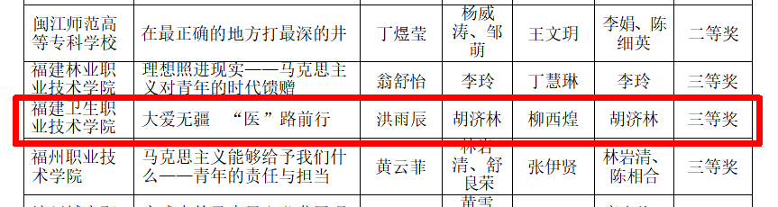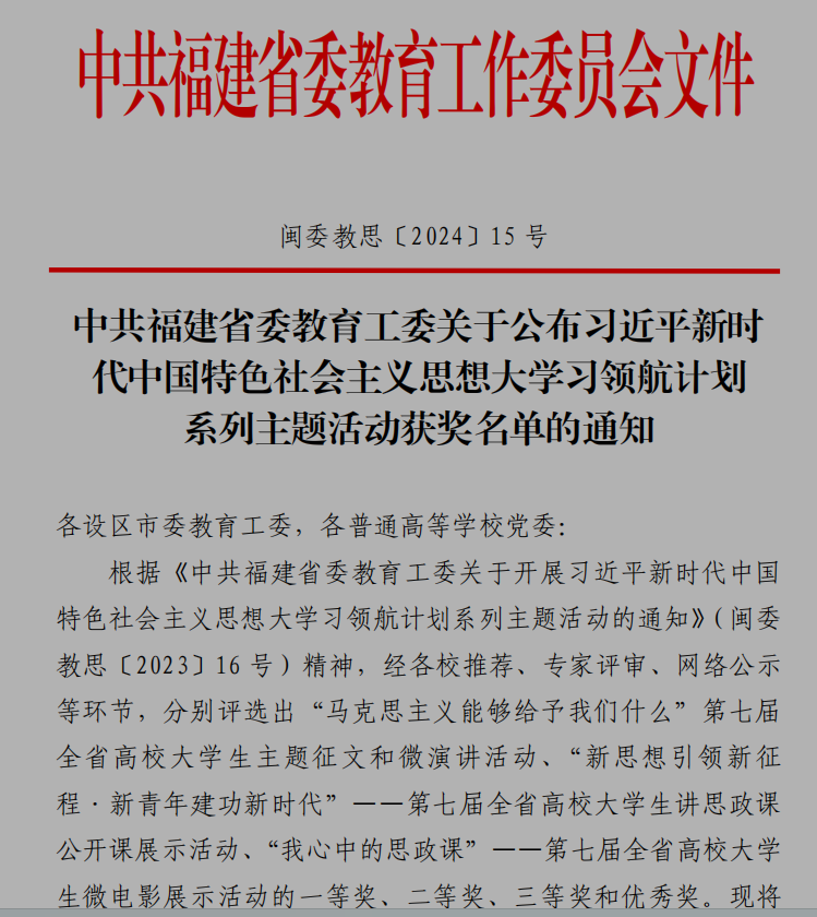 日前,由中共福建省委教育工作委員會(huì)主辦的習(xí)近平新時(shí)代中國(guó)特色社會(huì)主義思想大學(xué)習(xí)領(lǐng)航計(jì)劃系列主題活動(dòng)獲獎(jiǎng)名單揭曉,我校學(xué)生劉琦琛、許晶晶、李木子獲得“新思想引領(lǐng)新征程·新青年建功新時(shí)代”——第七屆全省高校大學(xué)生講思政課公開課展示活動(dòng)一等獎(jiǎng),洪雨辰、柳西煌獲得“馬克思主義能夠給予我們什么”第七屆全省高校大學(xué)生主題征文和微演講活動(dòng)三等獎(jiǎng)1項(xiàng),指導(dǎo)老師為胡濟(jì)林、劉穎。