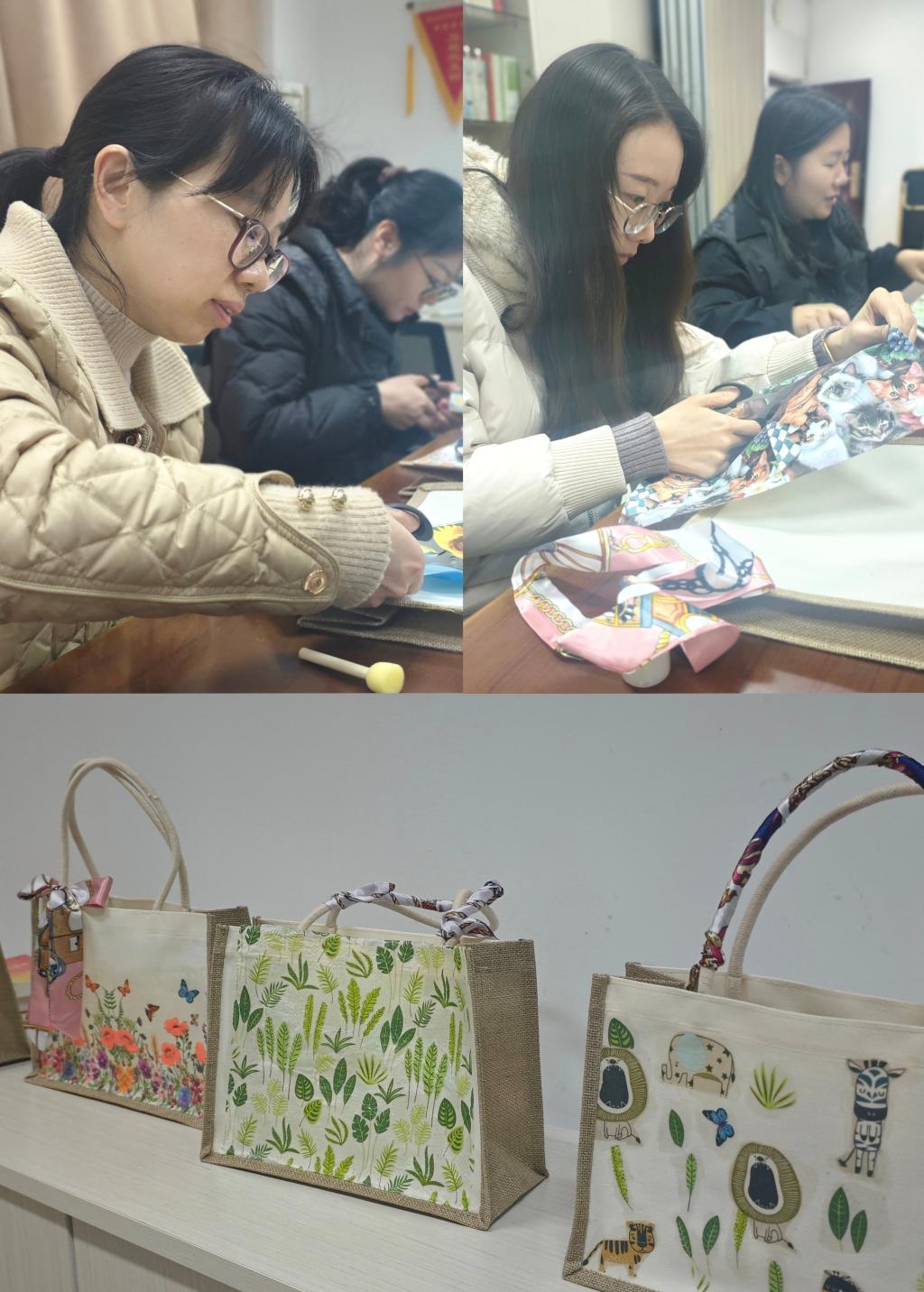 活動(dòng)現(xiàn)場(chǎng)氣氛熱烈,歡聲笑語(yǔ)不斷,大家紛紛拿起畫(huà)筆、剪刀和膠水,將五彩斑斕的圖案精心地拼貼在帆布包上,創(chuàng)作出獨(dú)一無(wú)二的藝術(shù)作品。