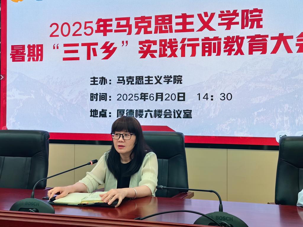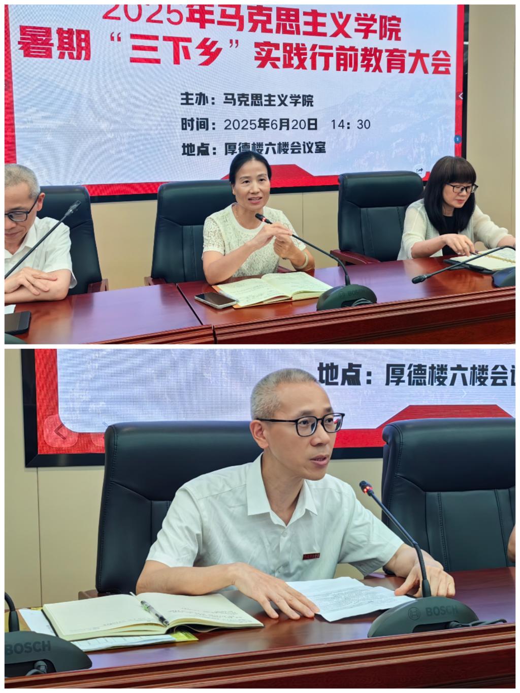 為深入學習貫徹習近平新時代中國特色社會主義思想,全面落實黨的二十大關于青年工作的重要部署,6月20日,馬克思主義學院在厚德樓六樓會議室舉行2025年暑期“三下鄉(xiāng)”社會實踐行前安全教育培訓會。馬克思主義學院黨總支書記、院長熊美蘭,副院長來朋珍,第二黨支部書記胡濟林以及“馬上逐夢隊”和“星火傳薪實踐隊”的指導老師和學生參加。會議由馬克思主義學院黨總支副書記賴文金主持。