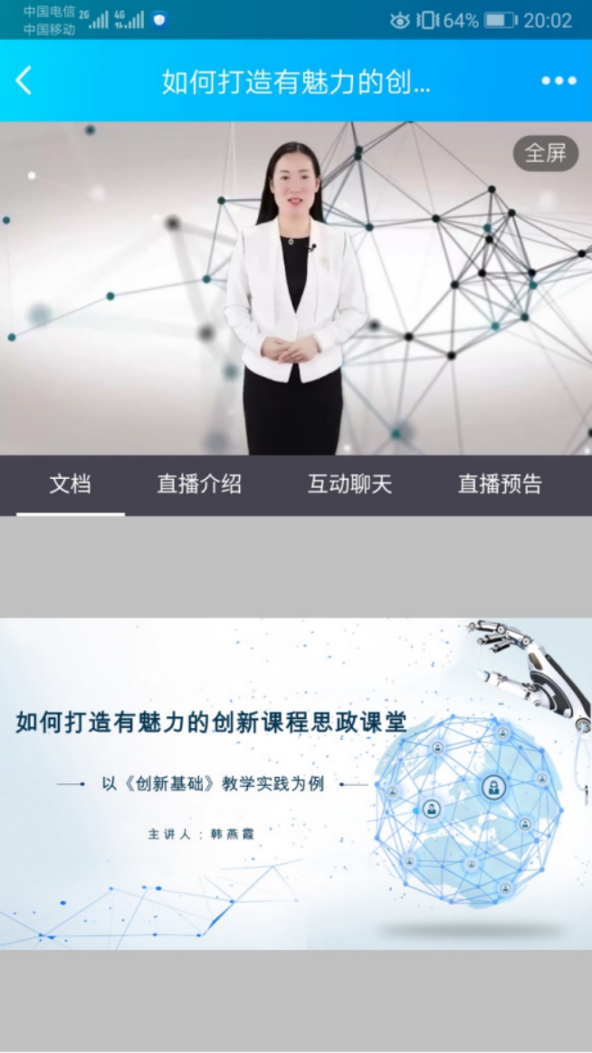 韓燕霞老師從創(chuàng)新青年說開啟了創(chuàng)新之旅,她對創(chuàng)新做了一個詳細(xì)的解讀,特別是強(qiáng)調(diào)了創(chuàng)新要作為人才適應(yīng)社會發(fā)展的第一資源。在講座中,韓老師多次強(qiáng)調(diào)課程思政的重要性,她認(rèn)為作為就業(yè)指導(dǎo)課程的教師,要在授課中融入課程思政的教育,所謂的課程思政其實(shí)質(zhì)不是在高校中增設(shè)一門課程,也不是增設(shè)一項(xiàng)活動,而是將思想政治教育融入課程教學(xué)和改革的各個環(huán)節(jié)、各個方面、才能真正的實(shí)現(xiàn)立德樹人潤物無聲。通過本次的公益直播講座,全體觀看的教師對于本學(xué)期開設(shè)的創(chuàng)新創(chuàng)業(yè)課程有了進(jìn)一步的認(rèn)識,特別是在授課中融入到課程思政的教學(xué)元素,讓學(xué)生在求職創(chuàng)業(yè)的過程中能夠更加明確自我的認(rèn)知能力和價值觀。