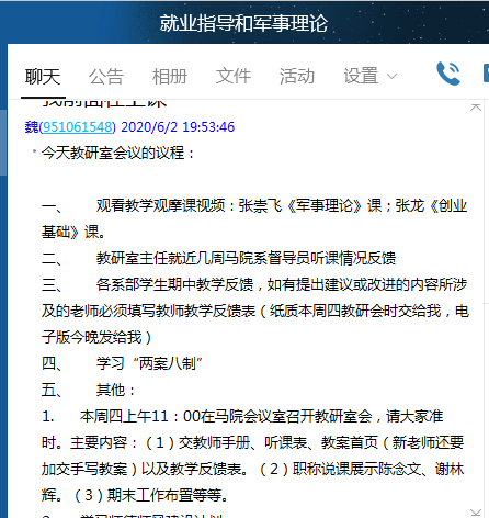 2020年6月2日晚8點,軍事理論與就業(yè)指導(dǎo)教研室通過QQ開展線上教研活動,活動由教研室主任魏立娜教授主持,教研室全體教師參加。