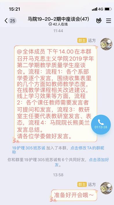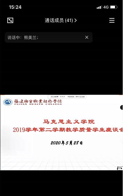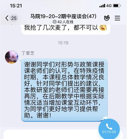 會(huì)議首先由各個(gè)系學(xué)生代表就本專業(yè)學(xué)生對(duì)于思想政治理論課教師在疫情期間線上教學(xué)態(tài)度、線上授課內(nèi)容、教學(xué)方法等方面的情況進(jìn)行反饋并對(duì)于教師教學(xué)內(nèi)容、教學(xué)態(tài)度以及教學(xué)方法提出改進(jìn)建議與反饋。在認(rèn)真聽取大家的發(fā)言后,概論教研室主任胡濟(jì)林表示,首先,這個(gè)學(xué)期我們?cè)诳箵粢咔榈奶厥獗尘跋麻_展教學(xué)活動(dòng),這是一個(gè)很大的創(chuàng)新,在這里,特別感謝各位學(xué)習(xí)委員的辛勤勞動(dòng),因?yàn)榫W(wǎng)絡(luò)教學(xué)對(duì)同學(xué)的管理很不容易,學(xué)習(xí)委員發(fā)揮很好的作用。其次,聽到同學(xué)們對(duì)老師的評(píng)價(jià)總體是積極向上的,對(duì)于同學(xué)們提出的意見和建議我們將反饋給老師,督促教師提出整改和解決。最后,臨近期末,希望大家繼續(xù)做好期末工作,在復(fù)習(xí)等方面有什么問題,及時(shí)跟老師溝通,做好期末復(fù)習(xí)工作。形勢(shì)與政策教研室主任丁愛芝表示,感謝同學(xué)們對(duì)形勢(shì)與政策課授課老師們的認(rèn)可。在特殊疫情時(shí)期,本課程總體教學(xué)情況良好,針對(duì)同學(xué)們提出的建議,本教研室的老師們還需要再接再厲,在后期教學(xué)中根據(jù)實(shí)際情況適當(dāng)增加課堂互動(dòng)環(huán)節(jié),為同學(xué)們更好地學(xué)習(xí)提供幫助。軍事理論與就業(yè)指導(dǎo)教研室代表教師張崇飛表示老師們將針對(duì)同學(xué)提出的教學(xué)建議認(rèn)真整改,改善線上教學(xué)存在的問題,努力提升整體教學(xué)質(zhì)量。