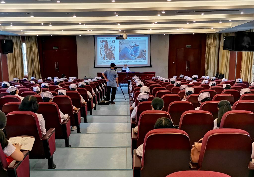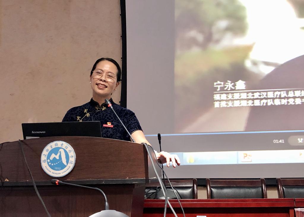 鄭翠紅副校長(zhǎng)以“‘疫’不容辭擔(dān)使命,仁心仁術(shù)護(hù)健康”為主要內(nèi)容,噙著淚飽含深情地講述著身邊生動(dòng)鮮活的感人故事。為方便救援,避免頭發(fā)殘留污染,福建援鄂醫(yī)療隊(duì)出征前,她親自為醫(yī)療隊(duì)同志剪去了最珍惜的長(zhǎng)發(fā)。在這場(chǎng)無(wú)硝煙的戰(zhàn)“疫”中,白衣戰(zhàn)士們義無(wú)反顧,逆行而上,用全員零感染、受援醫(yī)院和患者家屬都滿意的優(yōu)異成績(jī),完成黨和人民的重托,他們當(dāng)中最小的還不到20歲......在福建省援鄂醫(yī)療隊(duì)創(chuàng)作的優(yōu)美感人的《提燈女神》歌曲中,鄭翠紅副校長(zhǎng)激勵(lì)衛(wèi)院學(xué)子們將青春夢(mèng)想扎根祖國(guó)的廣袤大地,勵(lì)志勤學(xué),刻苦磨煉,在奮斗中綻放青春光芒,書寫無(wú)愧于時(shí)代的青春之歌。
