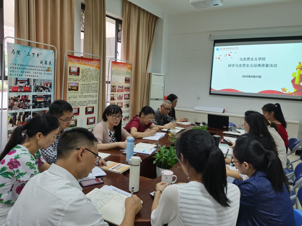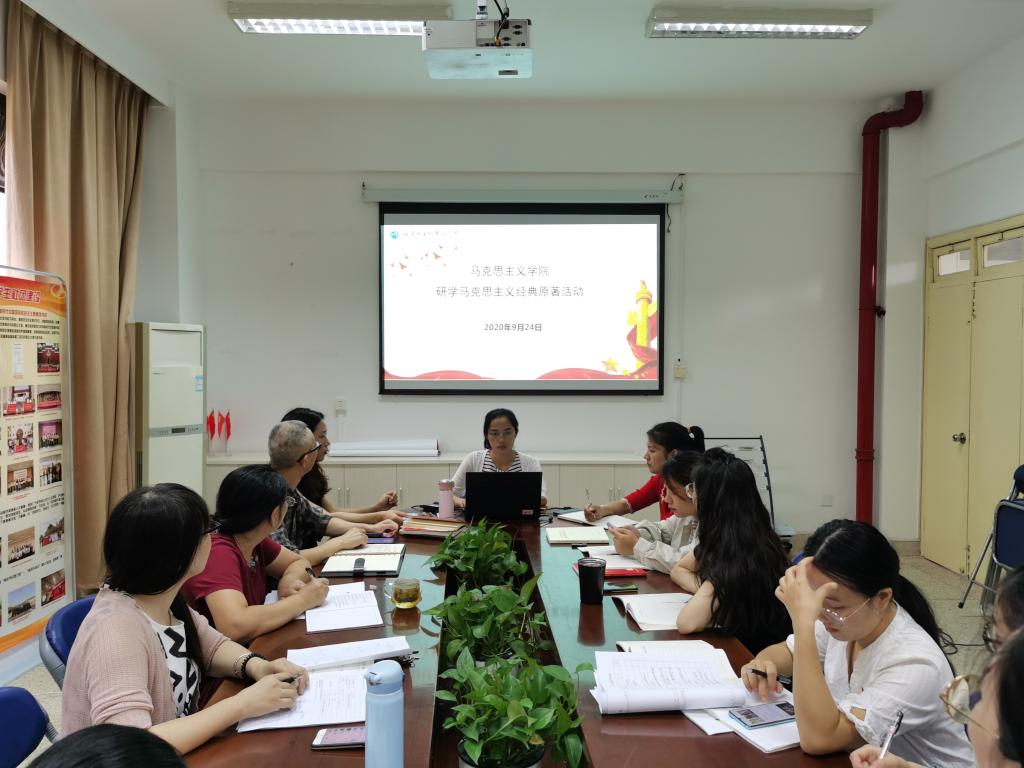 2020年9月24日上午,馬克思主義學院全體思政教師在會議室舉行了第三次馬克思主義經典原著研學活動,此次活動由馬克思主義學院院長熊美蘭主持,形勢與政策教研教師張茵珠主講。