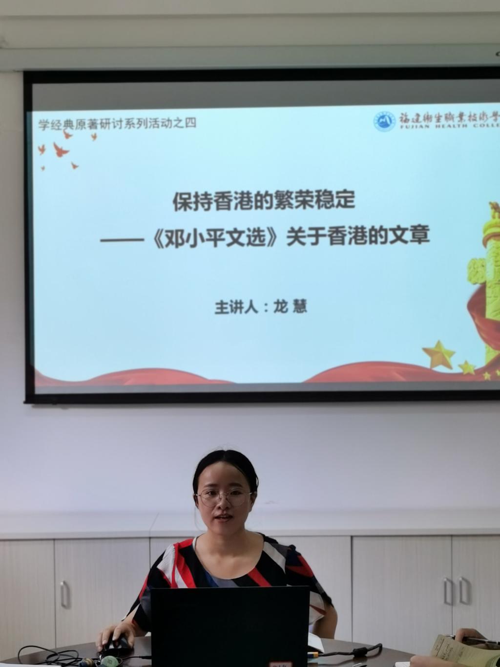 活動中,龍慧老師首先闡述了自己為什么選擇《鄧小平文選》關(guān)于香港問題文章進(jìn)行研讀,她談到,暑假期間重溫了《鄧小平文選》,更加深刻體會到鄧小平同志關(guān)于香港問題的重要講話的前瞻性。接著,她帶領(lǐng)大家一起學(xué)習(xí)、研討《鄧小平文選》中鄧小平同志關(guān)于香港問題的主要觀點(diǎn);最后,她為我們分享了她的學(xué)習(xí)體會。她說道,重溫經(jīng)典,能夠不斷提高自身的政治覺悟,只有理論上清醒,才能保持政治上的堅定。