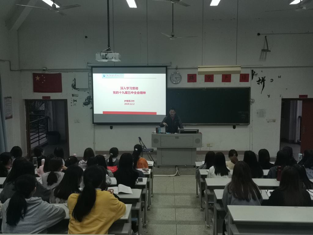 為學(xué)習(xí)和貫徹黨的十九屆五中全會(huì)精神,2020年12月2日下午,馬克思主義學(xué)院江洪老師在護(hù)理系209教室給“五結(jié)對(duì)”班級(jí)19助產(chǎn)302班宣講黨的十九屆五中全會(huì)精神。