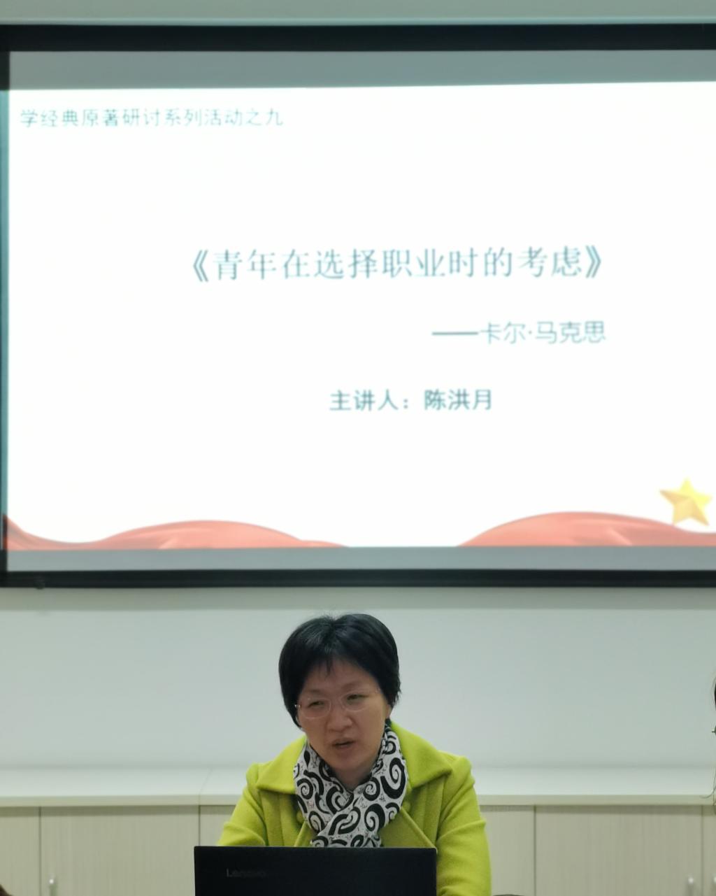 活動中,陳洪月老師首先介紹了《青年在選擇職業(yè)時的考慮》的寫作背景,馬克思在即將畢業(yè)的時候,沒有向其他同學一樣考慮選擇哪種具體職業(yè),而是把這個問題提高到對社會的認識和對生活的態(tài)度上加以考慮和回答。接著,她介紹了文章的主要觀點,并帶著大家一起重溫了原文中的經(jīng)典:“如果我們選擇了最能為人類福利而勞動的職業(yè),那么,重擔就不能把我們壓倒,因為這是為大家而獻身;那時我們所感到的就不是可憐的、有限的、自私的樂趣,我們的幸福將屬于千百萬人,我們的事業(yè)將默默地、但是永恒發(fā)揮作用地存在下去,面對我們的骨灰,高尚的人們將灑下熱淚?!弊詈螅窒砹俗约旱膶W習體會。當我們選擇了一份工作,我們就選定了一個方向、一個目標。工作不僅僅是為了生存或解決溫飽,從選定所要從事的職業(yè)那一刻起,我們就將一份希望寄托到了我們的追求之中,通過努力地工作去實現(xiàn)奮斗的目標,當隨著忙碌的工作,距離目標越來越近時,我們就會越發(fā)感受到工作的快樂。