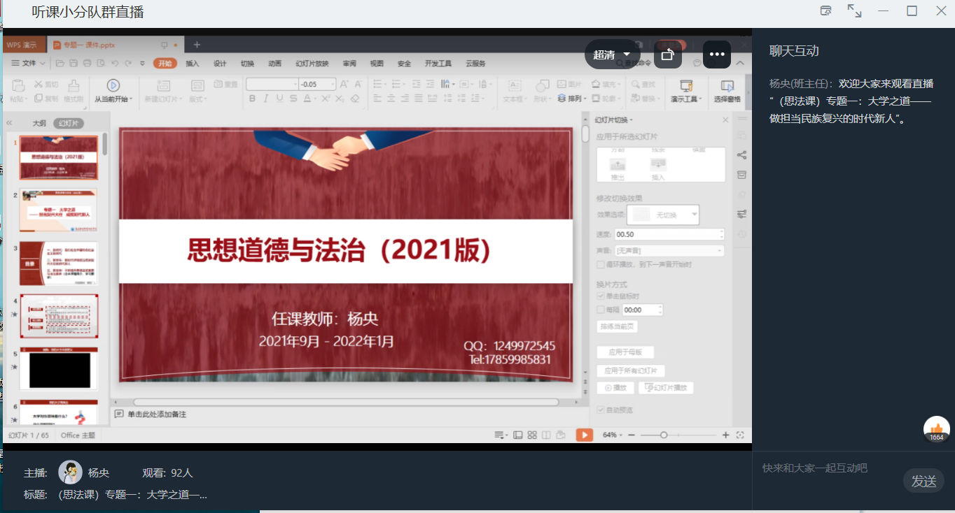 為進(jìn)一步理解2021版《思想道德與法治》新教材,加快課程建設(shè),提升教學(xué)質(zhì)量,使新教師盡快適應(yīng)教學(xué),并遵循科學(xué)防疫的要求?;A(chǔ)教研室于2021年9月17日下午通過釘釘在線教學(xué)平臺對新進(jìn)教師楊央老師開展了集中聽課活動(dòng),授課對象是21級護(hù)理317、318班,授課內(nèi)容是專題一:大學(xué)之道——做擔(dān)當(dāng)民族復(fù)興大任的時(shí)代新人。參與聽課的教師有馬克思主義學(xué)院院長熊美蘭,基礎(chǔ)教研室主任顏冰鳳,馬克思主義學(xué)院教師陳洪月、江洪、羅蕓等。