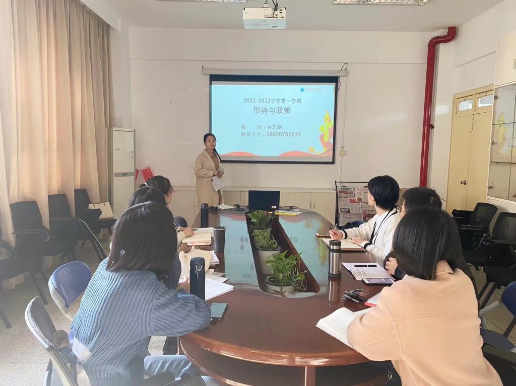 為全面提升教師教學(xué)質(zhì)量,加快課程建設(shè),規(guī)范和提升教學(xué)質(zhì)量,嚴(yán)格執(zhí)行兼課教師準(zhǔn)入制度,把好兼課教師入門關(guān),2021年12月7日下午,馬克思主義學(xué)院形勢(shì)與政策教研室在行政樓107會(huì)議室開(kāi)展兼課教師吳文娟試講活動(dòng),吳文娟授課內(nèi)容是《奮斗百年路 啟航新征程》。試講聽(tīng)課活動(dòng)由形勢(shì)與政策教研室主任鄭冰主持,形勢(shì)與政策教研室全體專職教師和部分馬克思主義學(xué)院教師參加。