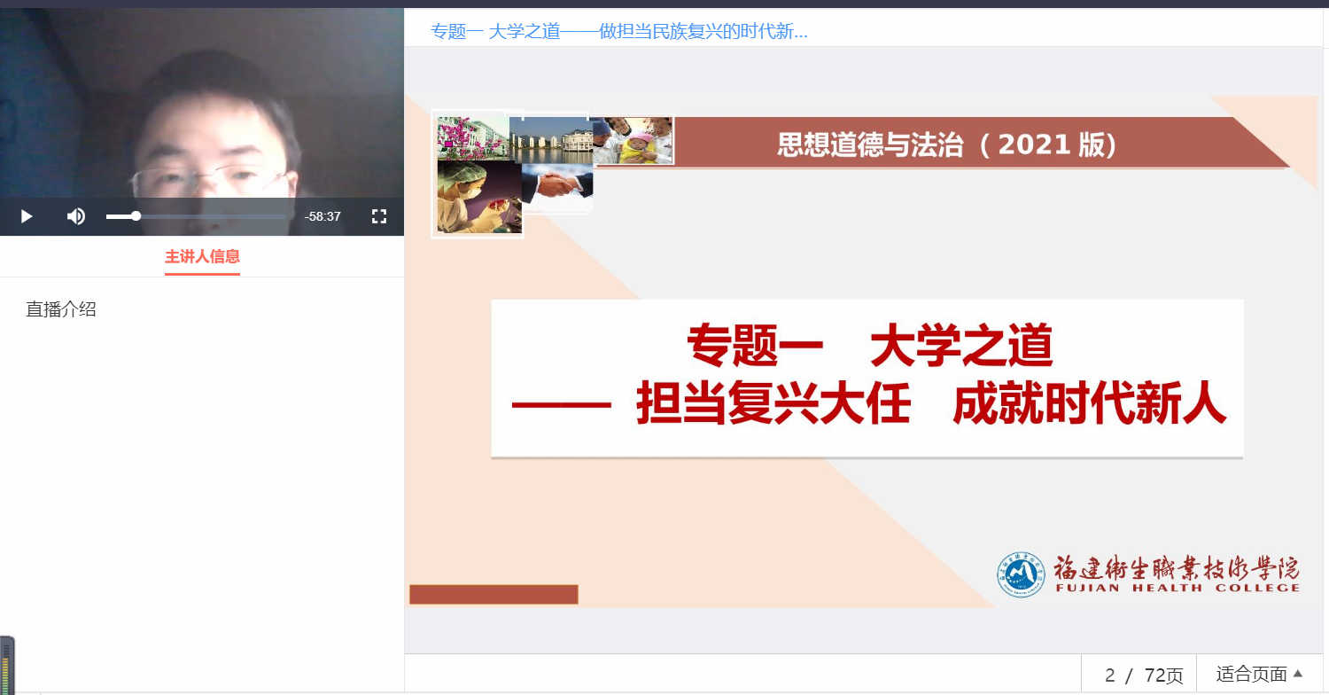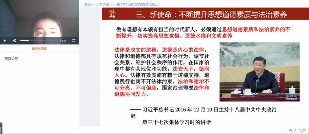 為進一步理解2021版《思想道德與法治》新教材,加快課程建設,提升教學質量,使新教師盡快適應教學,并遵循科學防疫的要求?;A教研室于2022年2月21日上午通過學習通在線教學平臺對新進教師王康開展了集中聽課活動,授課對象是21級衛(wèi)管301班、21級衛(wèi)管302班,授課內容是專題一:大學之道——做擔當民族復興大任的時代新人。參與聽課的教師有基礎教研室主任顏冰鳳,馬克思主義學院教師陳洪月、江洪、羅蕓等。