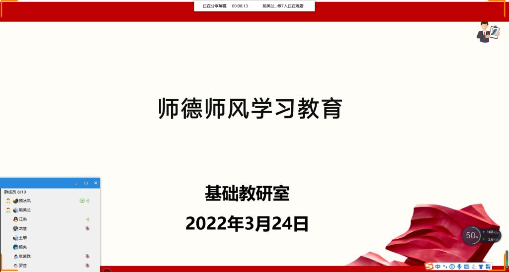 2022年3月24日上午,馬克思主義學(xué)院基礎(chǔ)教研室通過QQ群線上開展師德師風(fēng)學(xué)習(xí)教育活動?;顒佑苫A(chǔ)教研室主任顏冰鳳主持,教研室全體老師參加了活動。