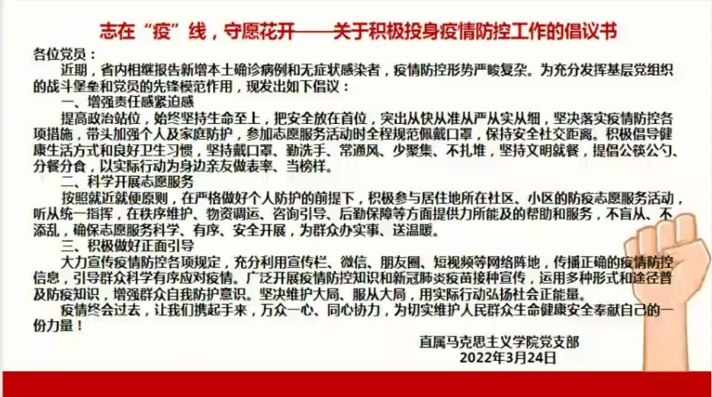 最后,馬克思主義學院對全體教師發(fā)出倡議,號召大家:一是要增強責任感、緊迫感。疫情防控要突出從快從準從嚴從實從細原則,以實際行動為身邊親友做表率、當榜樣。二是要科學開展志愿服務。在嚴格做好個人防護的前提下,積極參與居住地所在社區(qū)、小區(qū)的防疫志愿服務活動,為群眾辦實事、送溫暖。三是積極做好正面引導。大力宣傳疫情防控各項規(guī)定,傳播正確的疫情防控信息,引導群眾科學有序應對疫情。