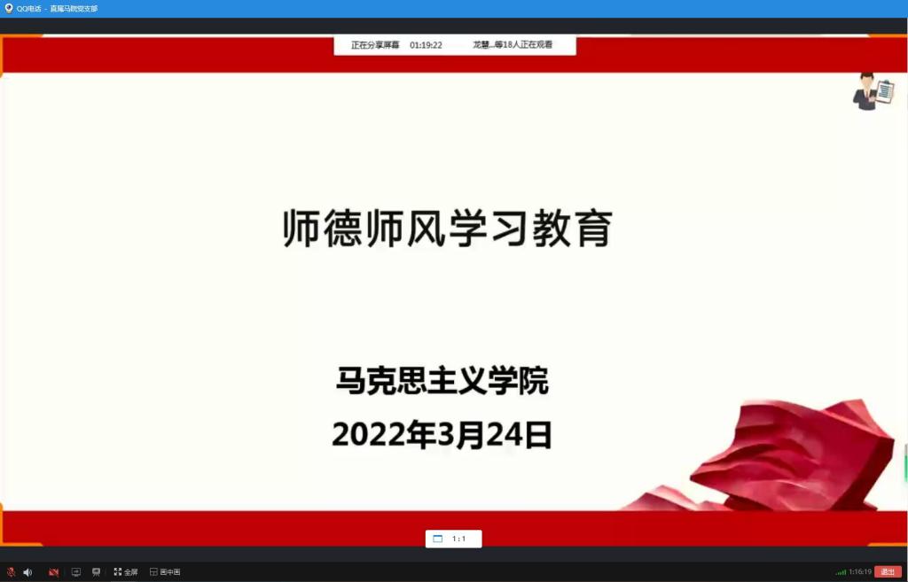 近期學校周邊出現(xiàn)了本土聚集性疫情,為強化思想引領,讓疫情防控成為師德培育的大課堂,2022年3月24日,馬克思主義學院在線上開展師德師風專題學習,本次學習活動由馬克思主義學院院長熊美蘭主持,馬克思主義學院全體教師出席本次活動。