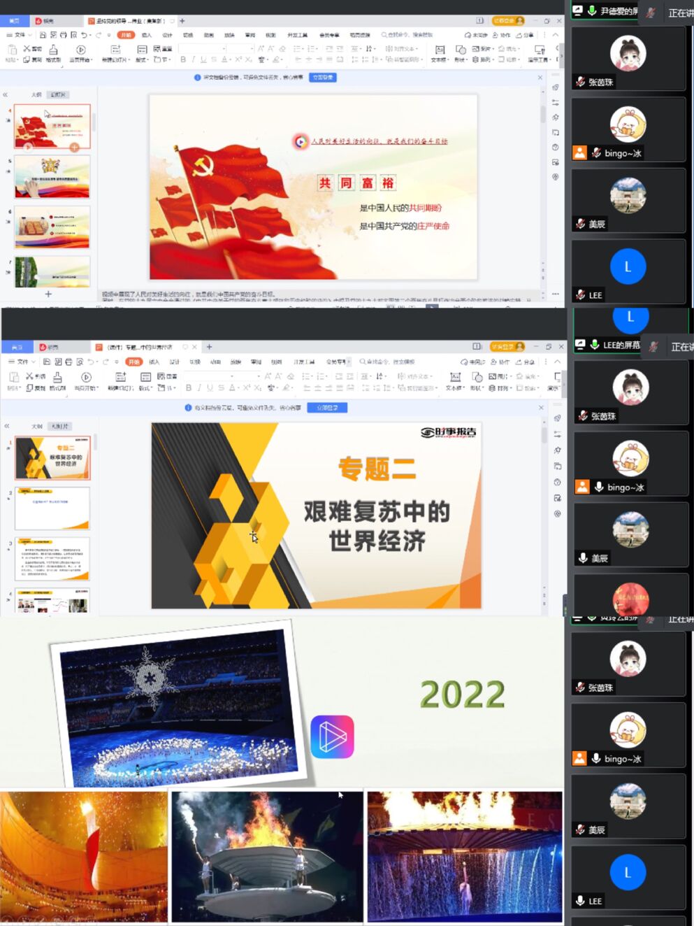 為落實教育部《“新時代高校思想政治理論課創(chuàng)優(yōu)行動”工作方案》和《關于加強新時代高?!靶蝿菖c政策”課建設的若干意見》要求,切實提升“形勢與政策”課的教學質量,2022年4月1日,馬克思主義學院召開第二輪“形勢與政策”集體備課會暨教學研討會。此次會議由兼課教師尹德愛、李寶珠、黃玲云作專題主旨備課,馬克思主義學院部分專兼職思政課教師參會,會議由形勢與教研室主任鄭冰主持。