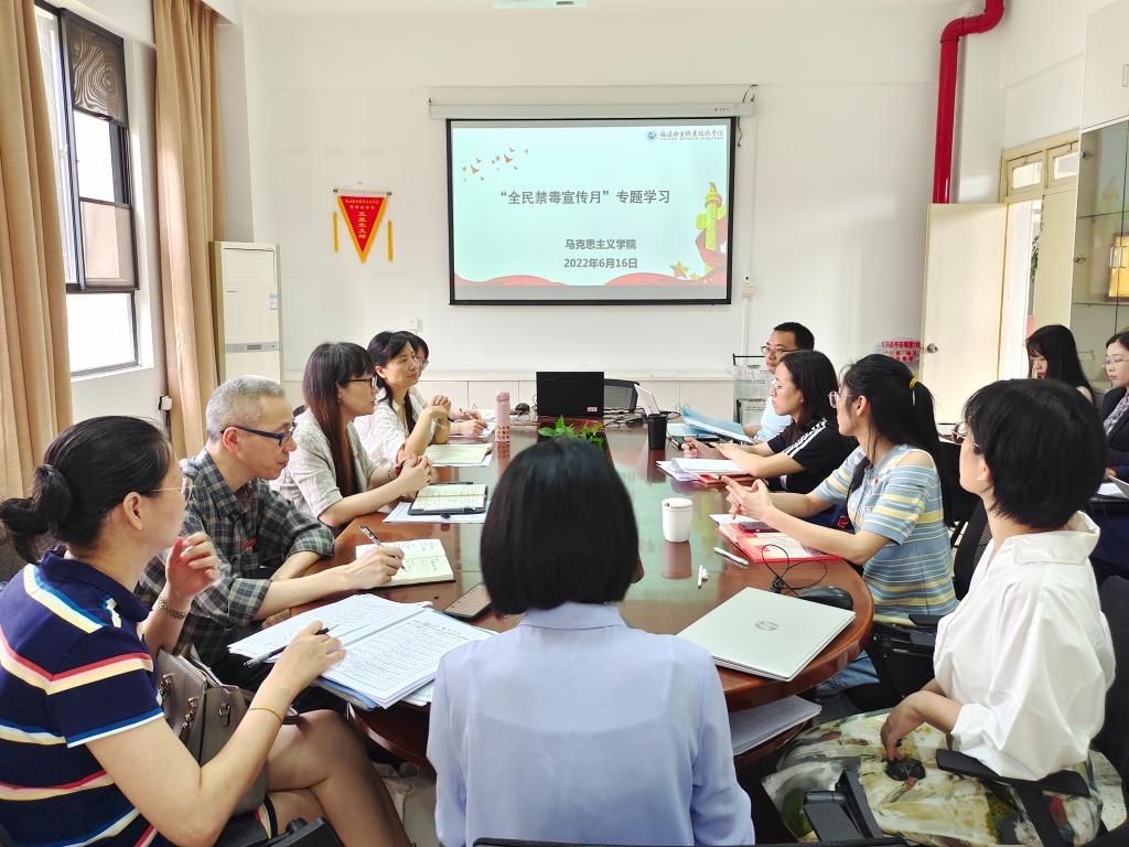 今年6月26日是第35個(gè)國(guó)際禁毒日,為深入貫徹習(xí)近平總書(shū)記對(duì)禁毒工作重要指示精神,全面落實(shí)中央和省委、省政府關(guān)于加強(qiáng)禁毒工作的決策部署,按照省禁毒委《關(guān)于加強(qiáng)新時(shí)代全民禁毒宣傳教育工作的實(shí)施意見(jiàn)》和我校相關(guān)工作方案的部署要求,2022年6月16日,馬克思主義學(xué)院開(kāi)展“全民禁毒宣傳月”專題學(xué)習(xí)活動(dòng)。
