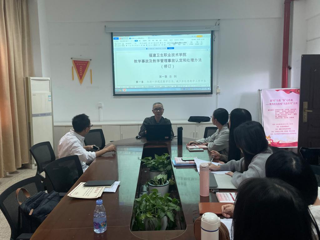 教研室主任胡濟(jì)林結(jié)合近年來學(xué)校通報(bào)的教學(xué)事故,對照《福建衛(wèi)生職業(yè)技術(shù)學(xué)院教學(xué)事故及教學(xué)管理事故認(rèn)定和處理辦法(修訂)》,逐條進(jìn)行學(xué)習(xí),并針對日常教學(xué)過程中容易出現(xiàn)的問題作了強(qiáng)調(diào),希望大家深入領(lǐng)會(huì)《福建衛(wèi)生職業(yè)技術(shù)學(xué)院教學(xué)事故及教學(xué)管理事故認(rèn)定和處理辦法》的精神,嚴(yán)格執(zhí)行。