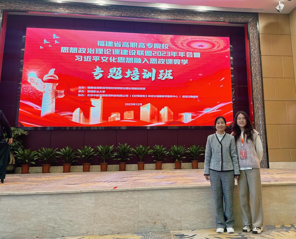 為深入開(kāi)展學(xué)習(xí)貫徹習(xí)近平新時(shí)代中國(guó)特色社會(huì)主義思想主題教育,貫徹落實(shí)習(xí)近平總書(shū)記在中央政治局第五次集體學(xué)習(xí)時(shí)的重要講話精神,堅(jiān)持不懈用習(xí)近平新時(shí)代中國(guó)特色社會(huì)主義思想鑄魂育人,推動(dòng)習(xí)近平文化思想融入思政課教學(xué),12月7日-10日,由福建省高職高專院校思想政治理論課建設(shè)聯(lián)盟主辦,黎明職業(yè)大學(xué)承辦的福建省高職高專院校思想政治理論課建設(shè)聯(lián)盟2023年年會(huì)暨習(xí)近平文化思想融入思政課教學(xué)培訓(xùn)班在泉州召開(kāi)。我院馬院副院長(zhǎng)來(lái)朋珍、專任教師朱麗燊前往參加。