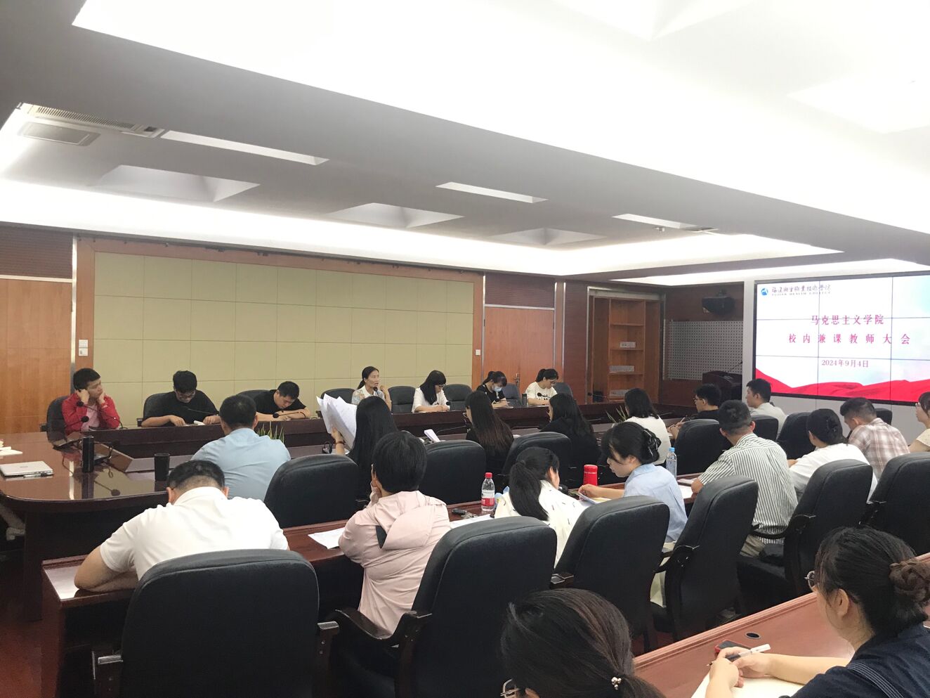 為進一步加強兼職兼課教師的管理,提高人才培養(yǎng)質(zhì)量,促進學(xué)院教學(xué)質(zhì)量的整體提升,2024年9月4日,馬克思主義學(xué)院在厚德樓四樓會議室召開2024-2025學(xué)年第一學(xué)期校內(nèi)兼職兼課教師教學(xué)工作會議。馬克思主義學(xué)院院長熊美蘭、副院長來朋珍、教研室主任以及本學(xué)期擔(dān)任教學(xué)任務(wù)的校內(nèi)兼職兼課教師等近40人參加了會議,會議由來朋珍主持。