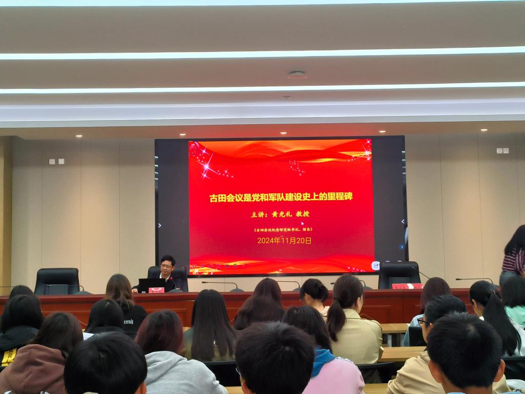 我校特別邀請古田會議紀念館黨組書記、館長,我校特聘教授黃光禮作《古田會議是黨和軍隊建設(shè)史上的里程碑》專題講座。黃光禮從“古田會議召開的歷史背景”“古田會議的歷史貢獻”兩大方面展開,以珍貴的史料、生動的敘述、真摯的情感,帶領(lǐng)我校師生回顧波瀾壯闊、光輝璀璨的歷史篇章,追尋思想建黨、政治建軍的革命道路,感悟不畏艱險、銳意進取的斗爭精神。他強調(diào),古田會議精神是偉大建黨精神的具體體現(xiàn),是中國共產(chǎn)黨人精神譜系的重要組成部分,使人民軍隊“浴火重生”,走向“紅旗漫卷”,對不斷推進新時代黨的建設(shè)新的偉大工程、加強國防和軍隊建設(shè)具有重大指導(dǎo)意義。