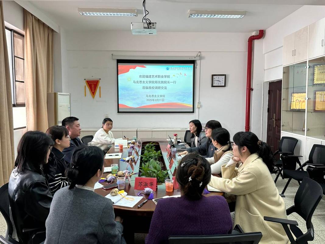 為深化新時(shí)代思政課改革創(chuàng)新,促進(jìn)校際經(jīng)驗(yàn)交流,3月11日,福建藝術(shù)職業(yè)學(xué)院馬克思主義學(xué)院院長(zhǎng)鄭元?jiǎng)P一行7人來(lái)我校調(diào)研交流。我校馬克思主義學(xué)院領(lǐng)導(dǎo)班子成員、教研室主任、課程負(fù)責(zé)人參加座談交流。