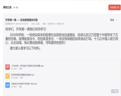 形勢與政策課教師利用QQ和超星學(xué)習(xí)通等平臺在線上給學(xué)生上了一堂特殊的課——《堅(jiān)定信心打贏疫情防控阻擊戰(zhàn)》,并與學(xué)生們開展線上互動討論;概論課教師在授課開學(xué)第一課“千年思想家馬克思”前,先給學(xué)生觀看抗擊疫情短視頻《同時(shí)間賽跑》,視頻結(jié)束后要求學(xué)生做關(guān)于疫情防控的練習(xí)題并組織討論發(fā)言;軍事理論課教師將疫情防控課程作為開學(xué)第一課的內(nèi)容,組織學(xué)生觀看《防范新型冠狀病毒宣傳視頻》。