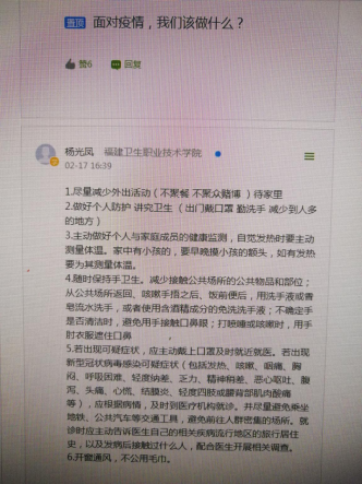 思政教師一是通過語音溝通、線上答疑、轉(zhuǎn)發(fā)防控知識等方式,教會學(xué)生預(yù)防和防控新型冠狀病毒,進(jìn)行健康理念和自我保護(hù)教育;二是通過解碼新型冠狀肺炎病毒及其主要癥狀,引導(dǎo)學(xué)生樹立科學(xué)觀念,不信謠、不傳謠;三是通過解讀習(xí)近平總書記關(guān)于新型黃莊肺炎疫情防控的重要講話精神,幫助學(xué)生認(rèn)識社會主義制度的優(yōu)越性,從而堅(jiān)定打贏疫情防控阻擊戰(zhàn)的信心。