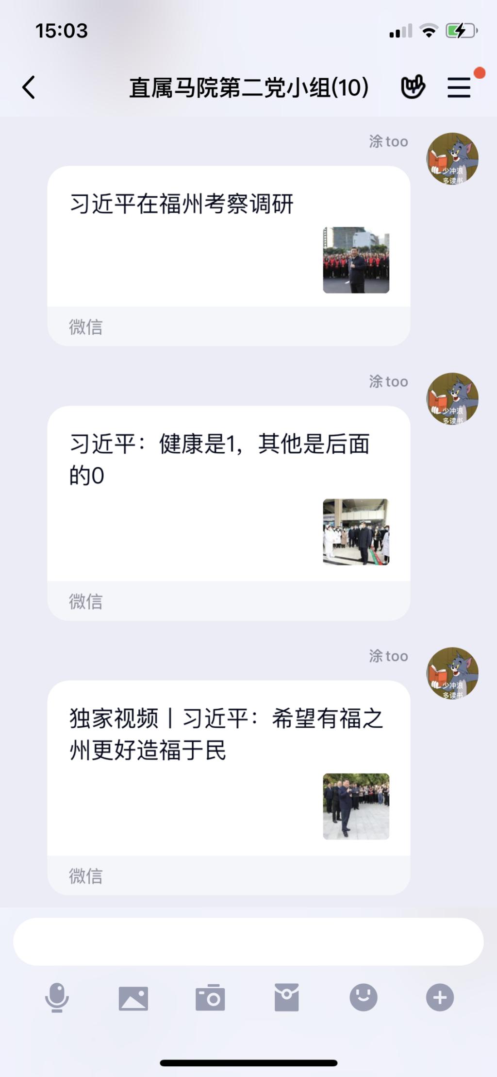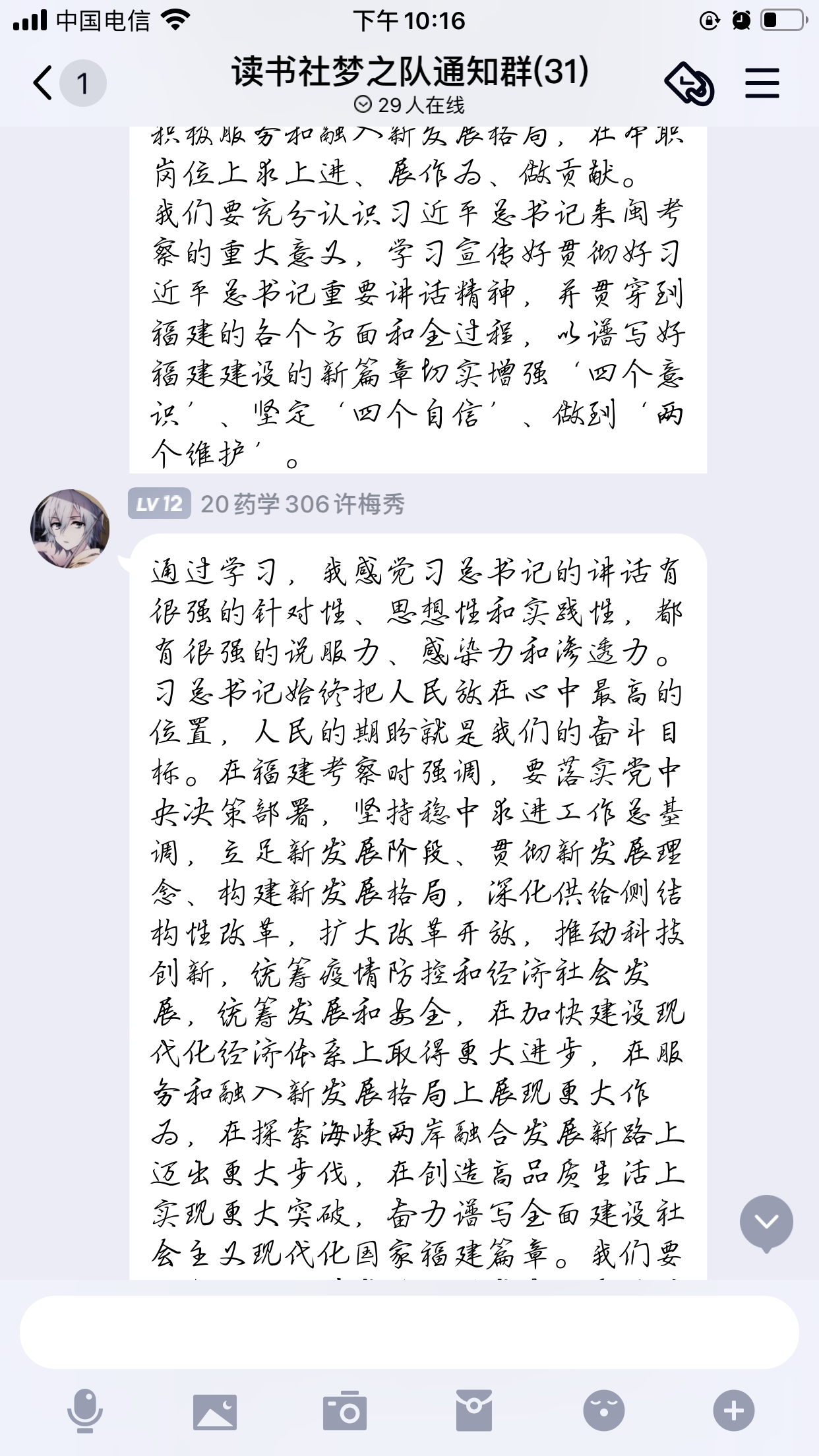 我校馬克思主義學院思政課教師從習近平總書記福建行第一站開始就密切關注相關信息,高度關注習近平總書記關心關注福建改革發(fā)展的相關問題。以“習近平福建行”為主題,馬院理論學習中心組召開理論學習中心組會,直屬馬克思主義學院第一、第二黨小組召開黨小組會進行熱烈討論。從QQ群即興交流中流露出我校思政人對國家發(fā)展、福建改革的情懷與關切。習近平總書記曾說:“對國之大者要心中數。”我校思政課教師不局限于即興交流,更是靜心思考,以“習近平福建行”為背景開展中心組學習及黨小組專題討論,還組織習近平新時代中國特色社會主義思想讀書社、時代先鋒等社團成員開展“習近平福建行”大討論。跟隨習近平總書記的腳步,討論的話題從南平、三明到福州、從國家公園、生態(tài)茶園、文化保護單位到醫(yī)院、農村、企業(yè)、學校。我校師生對改革發(fā)展的新形勢、新要求有了更加深刻的認識。