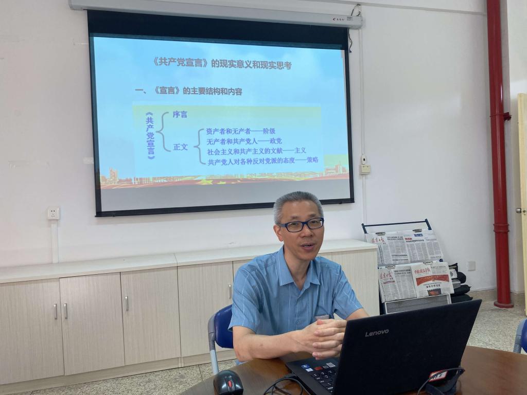 活動中,胡濟林首先從《宣言》的主要結(jié)構(gòu)和內(nèi)容、現(xiàn)實意義及價值兩個方面進行了研讀,介紹了《宣言》序言和正文兩個部分以及《宣言》對走好中國特色社會主義道路的重要指導(dǎo)作用等。其次,他從“馬克思主義理論對戰(zhàn)后資本主義發(fā)展的影響”“社會主義必然勝利”“社會主義在中國展現(xiàn)出的優(yōu)越性”三個方面談了讀《宣言》后的現(xiàn)實思考。