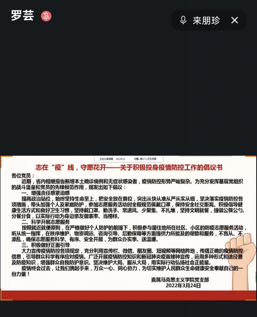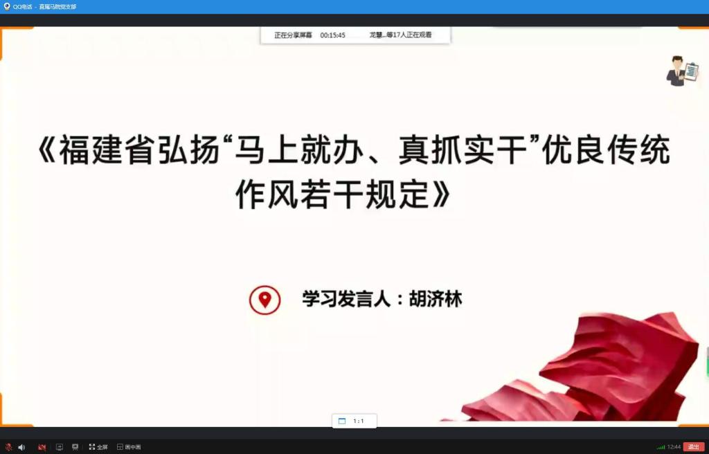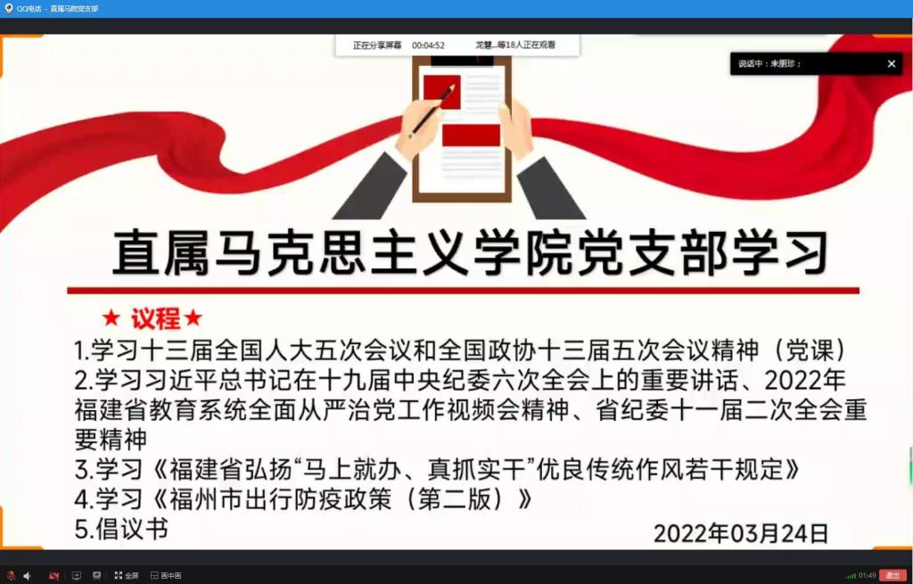3月24日上午,直屬馬克思主義學(xué)院黨支部齊聚云端開展理論學(xué)習(xí),會(huì)議由黨支部副書記來朋珍主持,全體黨員參加會(huì)議。會(huì)議傳達(dá)學(xué)習(xí)十三屆全國(guó)人大五次會(huì)議和全國(guó)政協(xié)十三屆五次會(huì)議精神(即全國(guó)兩會(huì)精神),習(xí)近平總書記在十九屆中央紀(jì)委六次全會(huì)上的重要講話,2022年福建省教育系統(tǒng)全面從嚴(yán)治黨工作視頻會(huì)精神,《福建省弘揚(yáng)“馬上就辦、真抓實(shí)干”優(yōu)良傳統(tǒng)作風(fēng)若干規(guī)定》和《福州市出行防疫政策(第二版)》等內(nèi)容。