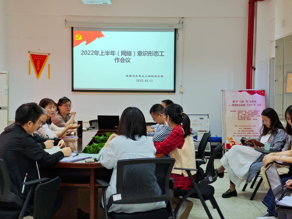 10月13日上午,直屬馬克思主義學(xué)院黨支部2022年上半年(網(wǎng)絡(luò))意識形態(tài)工作會議在行政樓107會議室召開。支部全體黨員參加了會議,會議由黨支部副書記來朋珍主持。