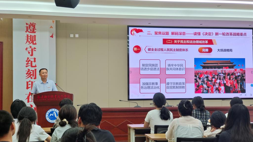 2024年9月12日,校黨委書記曾武祈在行政樓六樓會(huì)議室為馬克思主義學(xué)院黨總支全體教師黨員作題為“同心擘畫改革新藍(lán)圖 攜手奮進(jìn)強(qiáng)國(guó)新征程”黨課。