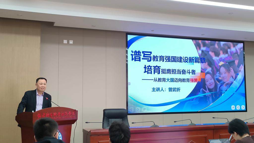 曾武祈緊緊圍繞“教育強國”這一主題,從“為什么建:堅實基礎 戰(zhàn)略支撐”“建成什么:“蓬勃發(fā)展 優(yōu)質均衡”“怎樣建設:深化改革 系統(tǒng)推進”“我校行動:錨定目標 篤行實干”等四個方面進行深入闡述。此次專題黨課讓支部全體黨員對“堅持教育優(yōu)先發(fā)展”“加快建設教育強國”“福建教育實踐”等一系列戰(zhàn)略決策部署有了更加深刻的認識,進一步增強思政課教師教書育人的責任感和使命感。