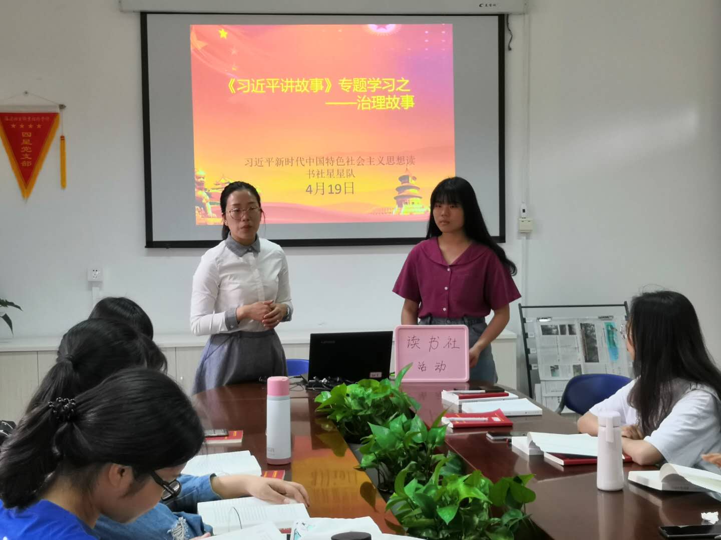 與書相伴的人生,一定有質(zhì)量,有生機(jī);書香飄溢的社團(tuán),一定有內(nèi)涵,有發(fā)展。伴著林徽因的“你是人間的四月天”,我們于4月19號(hào)在行政樓107開展了《習(xí)近平講故事》中的“治理故事”專題讀書活動(dòng),出席會(huì)議的有指導(dǎo)老師楊盈,星星分隊(duì)學(xué)生代表。