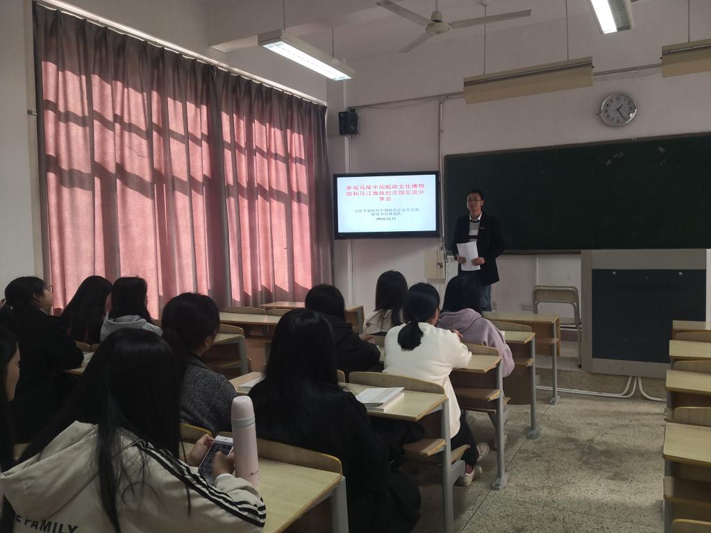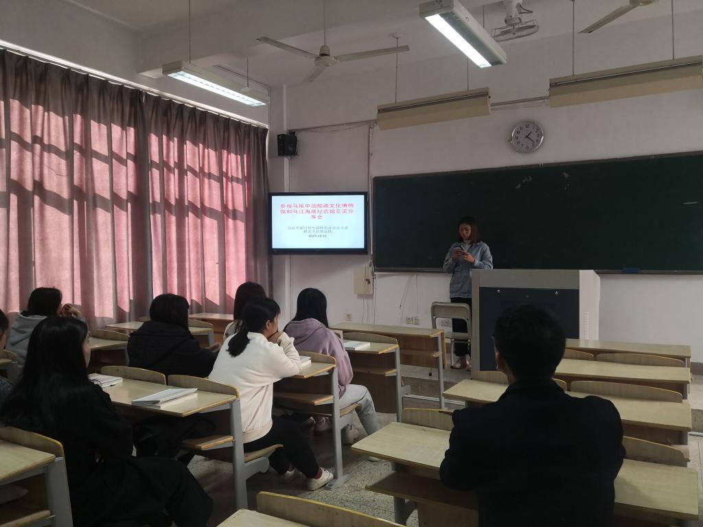 首先江洪老師根據(jù)參觀內(nèi)容,結(jié)合歷史,系統(tǒng)地梳理了馬江海戰(zhàn)和中國船政文化相關(guān)內(nèi)容,并對一些具體內(nèi)容進(jìn)行了深入講解。緊接著致遠(yuǎn)隊成員劉婧和林詩怡先后上臺分享了自己參觀馬江海戰(zhàn)紀(jì)念館和中國船政文化博物館的心得體會。劉婧同學(xué)分享了中坡炮臺和中法馬江海戰(zhàn)遺址等大量的圖片及介紹,她從中深切體會到官兵們不屈抗?fàn)幍挠職?。林詩怡同學(xué)分享了洋務(wù)運(yùn)動興起的背景,以及著名歷史人物左宗棠和沈葆楨創(chuàng)立船政的事跡,展示了中國近代船政的發(fā)展過程。臺下聽講的同學(xué)聚精會神,時不時發(fā)表自己的想法。