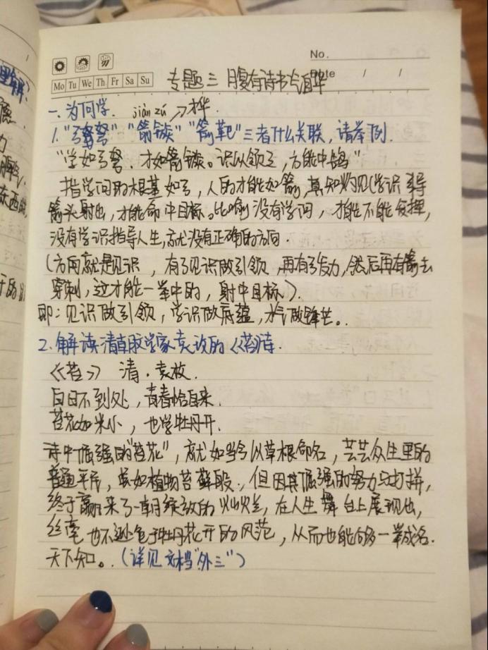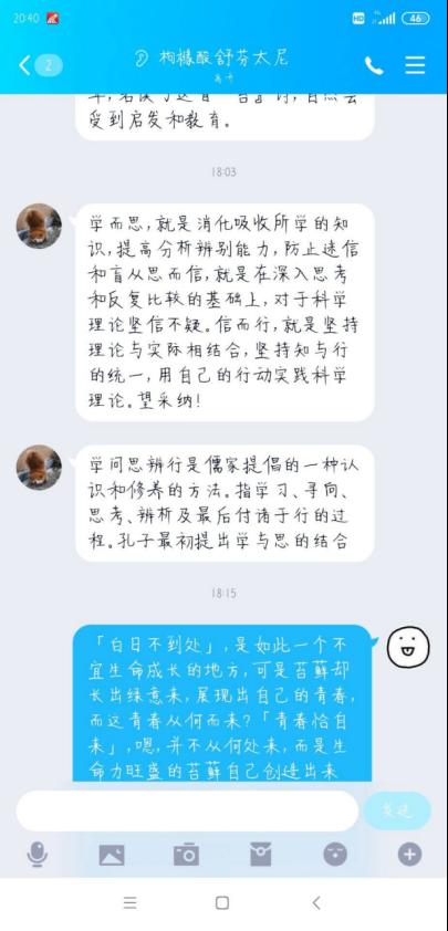 結合本專題內(nèi)容,熊老師拋出如下問題:“弓弩”“箭鏃”“箭靶”三者什么關聯(lián)?清朝文學家袁玫的《苔》詩體現(xiàn)了怎樣的精神?如何運用人才學中的蓄電池理論?結合“學”“問”“思”“辨”“行”,談談你對學習方法的理解?在討論交流的過程中,師生思想不斷交集,結合實際的知識學習充滿了魅力與力量。通過學習,作為朝氣蓬勃的青年一代,同學深深體會到,有義務推動習近平新時代中國特色社會主義思想的生動闡釋與廣泛傳播,也有責任傳遞社會正能量。同時運用新媒體的形式,將傳統(tǒng)文化和思想政治結合在一起,從朗朗上口的古詩詞中也理解了很多思想。在熊美蘭老師的帶領下,大家一起學習了習近平總書記一系列重要講話、文章、談話中所引用的古代典籍和經(jīng)典名句,收獲頗多。由于此次疫情特殊時期,學習條件不能媲美學校課堂條件的情況下,同學們在云端中仍然能保持良好學習狀態(tài),竭盡所能地完成學習任務,不僅是對指導老師是一個挑戰(zhàn),對于同學們而言,更是一件非常有意義的事情。