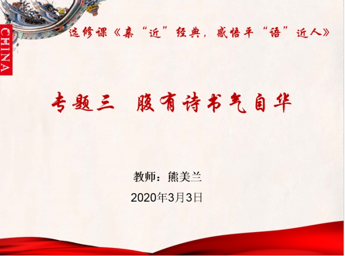 為學習貫徹習近平新時代中國特色社會主義思想,傳承中國傳統(tǒng)優(yōu)秀文化精神,堅定“四個自信”,我校習近平新時代中國特色社會主義思想讀書社原夢隊(簡稱“讀書社”),于2020年3月3日晚7點在學習通、QQ群等網(wǎng)絡平臺開展《平“語”近人》之腹有詩書氣自華的專題學習。