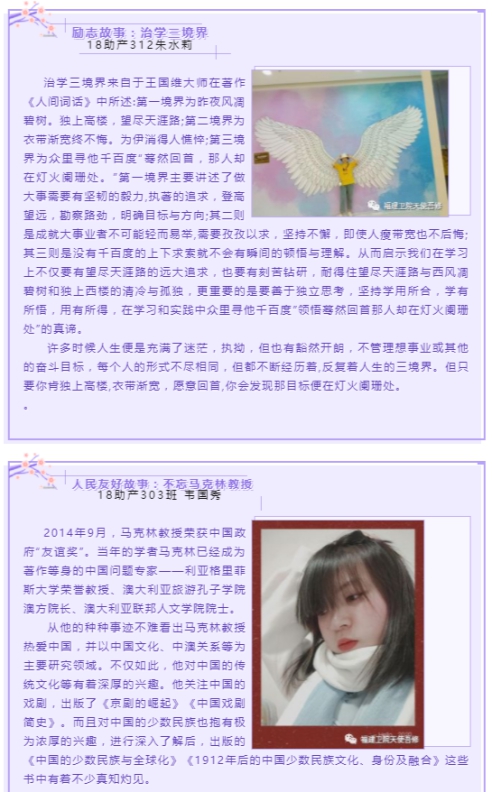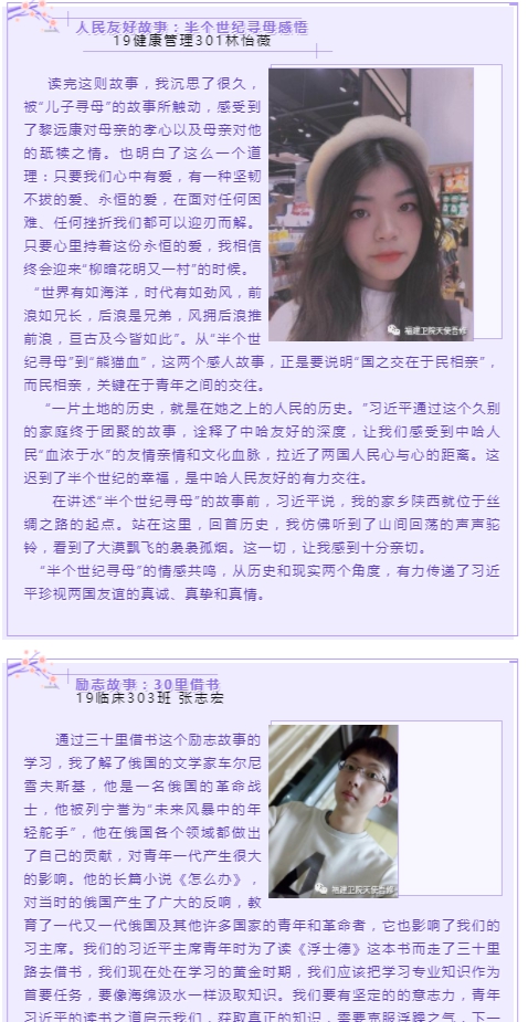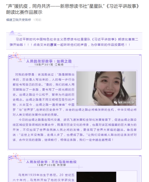3月10日—3月11日,新思想讀書社星星隊開展主題為“聲”援抗疫,同舟共濟的實踐專題學習。此次實踐專題結合當前疫情防控形勢,同學們通過前期的理論專題學習,選取感人故事開展網絡錄播在線講故事的形式,提交到網絡平臺,并且在3月12日順利通過福建衛(wèi)院天使吾修公眾號開展尋找“好聲音”的投票活動。經過4天線上激烈的投票,終于選出了前6名同學,他(她)們分別是18助產301班江曉煬19針推301班 曹文秀 19健康管理301林怡薇19預防302 王思靈 19預防302班 歐陽佳怡 19針推302班 吳瑩瑩 。
