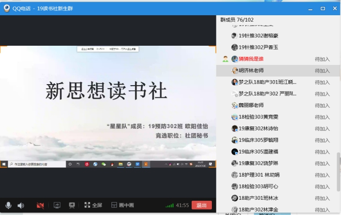 在全國上下萬眾一心防控新冠肺炎疫情之時(shí),同學(xué)們堅(jiān)守宅家“停課不停學(xué)”,習(xí)近平新時(shí)代中國特色社會(huì)主義思想讀書社堅(jiān)持“停課不停社團(tuán)活動(dòng)”,值此2018級社團(tuán)干事工作即將滿一周年之際,為實(shí)現(xiàn)新老干事工作的順利交接,老帶新幫帶工作的順利銜接,盡快培養(yǎng)新一屆干事的責(zé)任心和組織能力,經(jīng)過前期工作的周密謀劃和精心籌備,2020年3月20日(周五)晚上7點(diǎn),習(xí)近平新時(shí)代中國特色社會(huì)主義思想讀書社利用QQ工作群網(wǎng)絡(luò)平臺(tái)舉行線上第四屆換屆選舉大會(huì),新思想讀書社全體成員參加了本次大會(huì),同時(shí)出席會(huì)議的還有來自馬院的熊美蘭、魏立娜、楊盈、胡濟(jì)林和江洪等5位指導(dǎo)老師。
