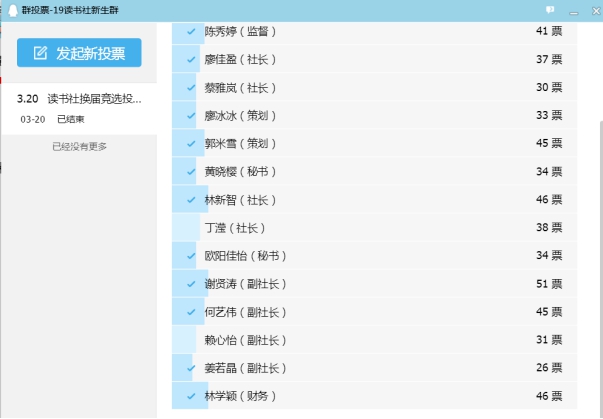 接下來,來自讀書社5個(gè)分隊(duì)共14名社團(tuán)成員依次參與競選,他們邊展示精心準(zhǔn)備的PPT,邊侃侃而談,暢述自身對社團(tuán)的認(rèn)知、對競選崗位的性格和能力的儲(chǔ)備,展望社團(tuán)工作的未來規(guī)劃。在每位競選演講后,在場的社團(tuán)成員和指導(dǎo)老師與競選者即時(shí)進(jìn)行互動(dòng)提問與回答。在相互交流環(huán)節(jié)中,選舉人與候選人進(jìn)一步加深了了解,會(huì)場氣氛嚴(yán)肅而不失熱烈活躍,促進(jìn)了大家對社團(tuán)性質(zhì)的理解和對未來發(fā)展的美好期許。之后,以無記名投票方式,每個(gè)人在QQ群投票平臺(tái)投下了神圣而莊重的選票,以票數(shù)選出了新一屆的讀書社干事人選。他們分別是:林新智、陳秀婷、謝賢濤、賴心怡、廖冰冰、黃曉櫻、郭米雪、廖佳盈、蔡雅嵐、歐陽佳怡、何藝偉、丁瀅和林學(xué)穎(排名不分先后)。