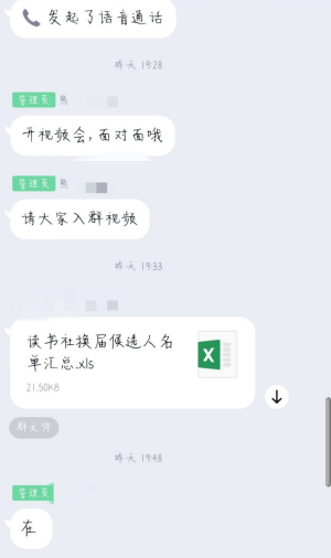 在13位同學(xué)的演講結(jié)束后,會議進入第二個議程,新干事退出群聊,由指導(dǎo)老師和18級正副社長進行討論確定每個崗位最合適的人選,并由雷榕芳社長在新思想讀書社工作群中公示名單。