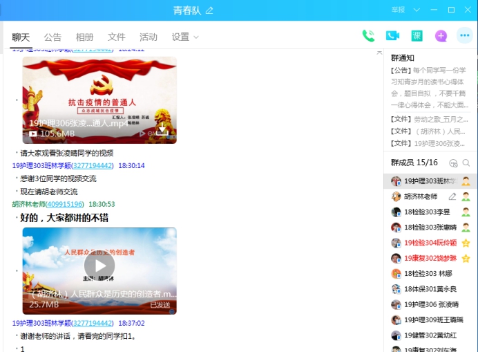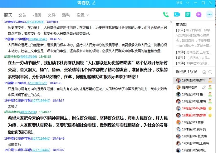 同學(xué)們在QQ進行簽到后,首先楊軍、魯麗、張凌晴3位同學(xué)分別向同學(xué)們進行了《為了人民謀發(fā)展的人大代表——季炳云》、《革命戰(zhàn)爭年代以及社會主義建設(shè)時期的人民觀》以及《抗擊疫情的普通人》的分享和交流,她們的分享讓我們明白了人民群眾是維護社會穩(wěn)定的主體力量,也是社會大局持續(xù)穩(wěn)定的源頭活水。