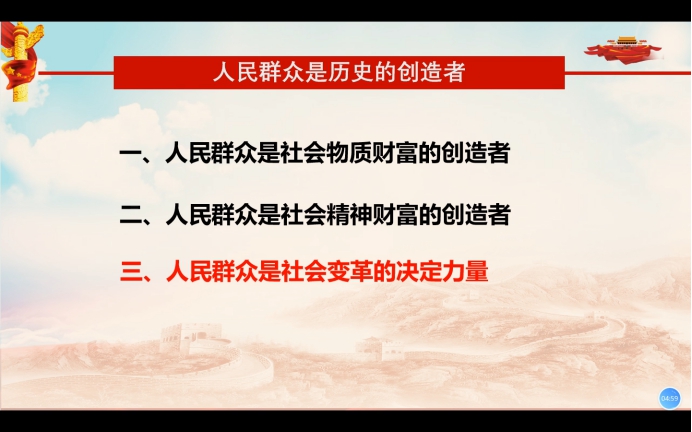 同學(xué)們進行視頻交流后,胡濟林老師進行了《人民群眾是歷史的創(chuàng)造者》的專題報告。胡濟林老師從“人民群眾是社會物質(zhì)財富的創(chuàng)造者”、“人民群眾是社會精神財富的創(chuàng)造者”、“人民群眾是社會變革的決定力量”三個方面向我們講述了為什么人民群眾是歷史的創(chuàng)造者。通過學(xué)習(xí),我們認識到人民群眾是一個歷史范疇,是指一切對社會歷史起著推動作用的人們。人民群眾是中國共產(chǎn)黨的執(zhí)政之基、力量之源。
