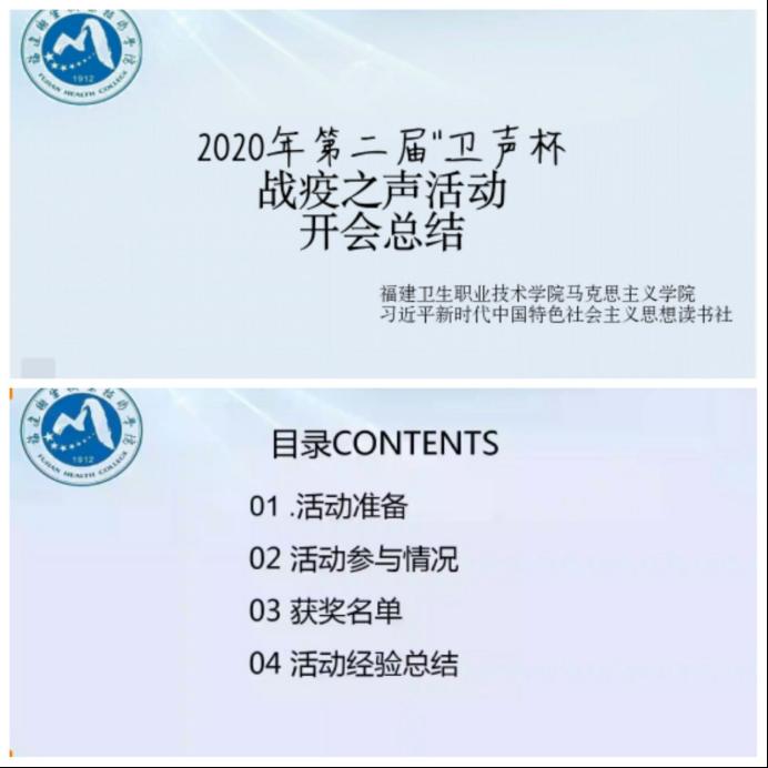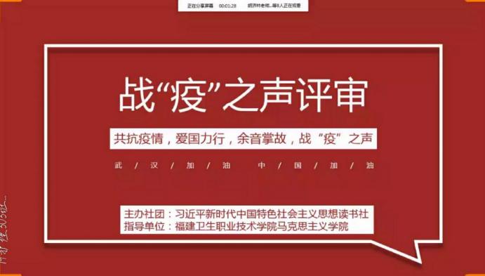 我校習(xí)近平新時代中國特色社會主義思想讀書社開展的第二屆"衛(wèi)聲杯"戰(zhàn)"疫"之聲活動進入尾聲,收到52件作品申報參評,入圍作品15件于福建衛(wèi)院天使吾修公眾號線上進行的公眾投票已截止。在進行了統(tǒng)計票數(shù)和作品整理后,于2020年5月6日晚7點,在QQ群平臺召開作品評審視頻會議。評審團由4位馬克思主義學(xué)院指導(dǎo)老師及8名讀書社干事組成,秉著公平公正與認(rèn)真負(fù)責(zé)的態(tài)度做好作品評審工作。