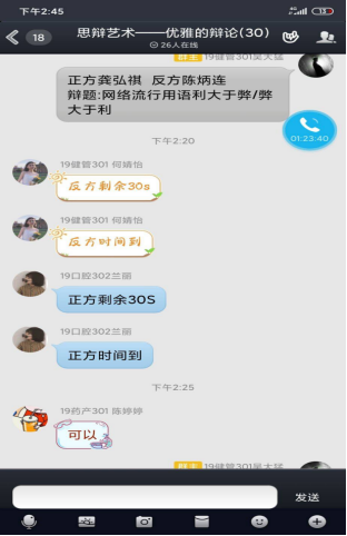 人在家中坐,切磋課中來。2020年5月12日演講與辯論社團在“思辨藝術——優(yōu)雅的辯論QQ群”如期舉行一場別開生面的1v1辯論賽。本次的指導老師徐舒寧,選修課全體同學參加了此活動。