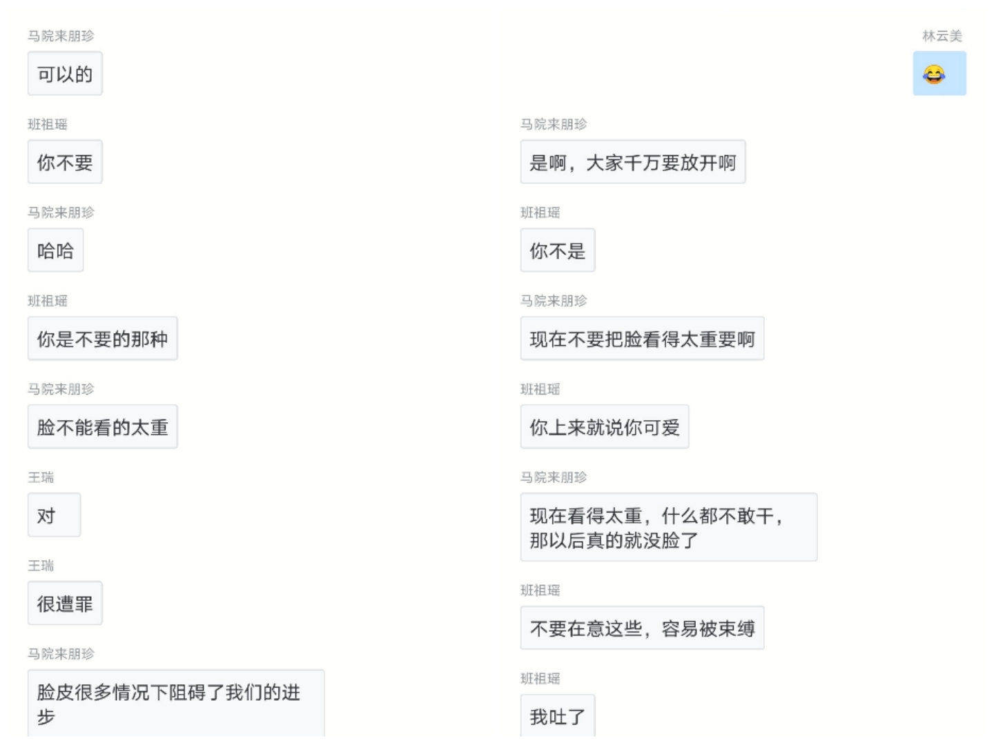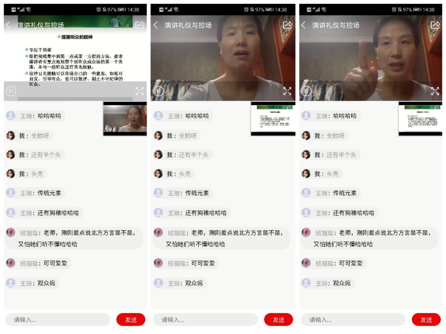其中,作為班長的王旭熙同學(xué)以其主題為“不要臉”的脫口秀使人印象深刻,深入人心,還有鄭盈盈同學(xué)講述的“健忘”故事,引起了大家的強(qiáng)烈共鳴。同時,來朋珍老師及演講班的同學(xué)在其聊天框里“實時熱聊”,對同學(xué)們的表現(xiàn)進(jìn)行了“一對一”的點(diǎn)評。