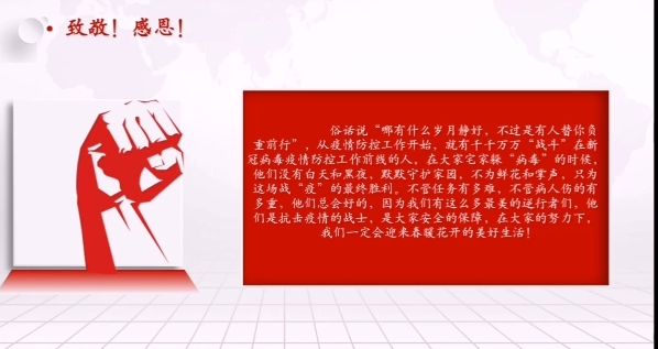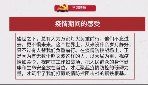 胡老師報(bào)告結(jié)束后,楊軍、鐘程雅、林學(xué)穎3位同學(xué)分別向同學(xué)們進(jìn)行了《網(wǎng)紅醫(yī)生張文宏》、《舍小家為大家》以及《戰(zhàn)疫黨員趙文波》的分享和交流,她們的分享讓我們明白了在戰(zhàn)疫時(shí)黨員和醫(yī)生們“把別人的幸福當(dāng)做自己的幸福,把鮮花奉獻(xiàn)給他人,把棘刺留給自己”的舍小家為大家的精神與奉獻(xiàn)。他們的這種頑強(qiáng)拼搏、大公無(wú)私精神詮釋著蒙古馬的獨(dú)特內(nèi)涵。