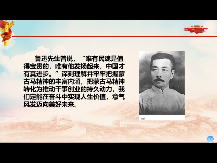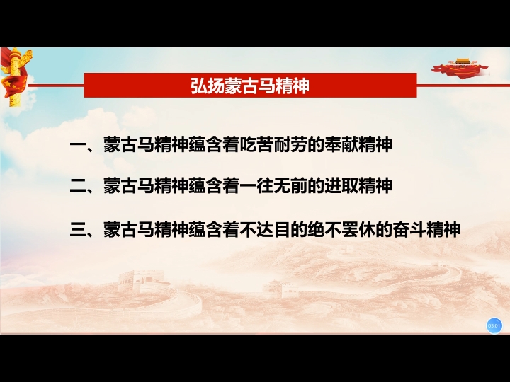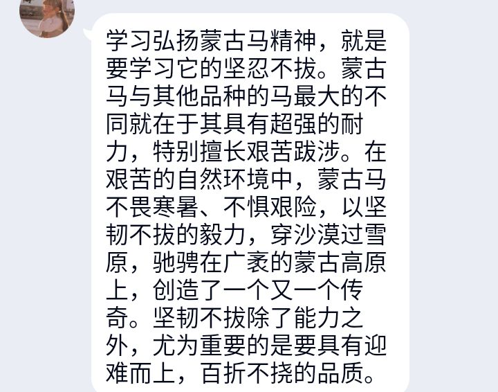最后,讓我們?cè)趯W(xué)習(xí)生活工作中發(fā)楊蒙古馬精神,奮勇拼搏,砥礪前行!