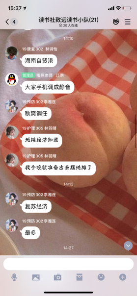 2020年6月9日下午,習近平新時代中國特色社會主義思想讀書社致遠隊在QQ群開展學習《習近平用典》心得體會分享交流活動,這也是習近平新時代中國特色社會主義思想讀書社社團選修課《習近平用典》的最后一課。讀書社致遠隊成員全員準時到課參加學習,活動由指導老師江洪老師主持。