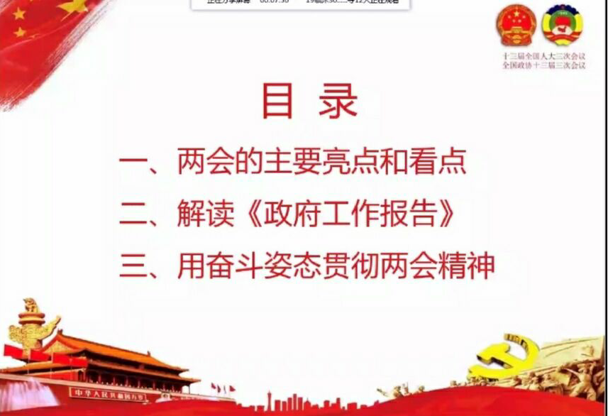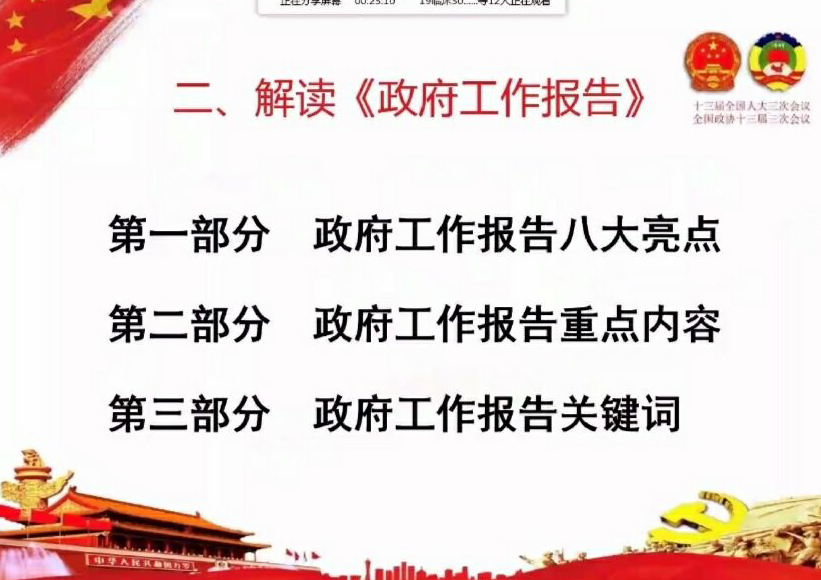 熊美蘭老師將講座內(nèi)容分為三個(gè)部分:一、兩會(huì)的主要亮點(diǎn)和看點(diǎn);二、解讀《政府工作報(bào)告》;三、用奮斗的姿態(tài)貫徹兩會(huì)精神。