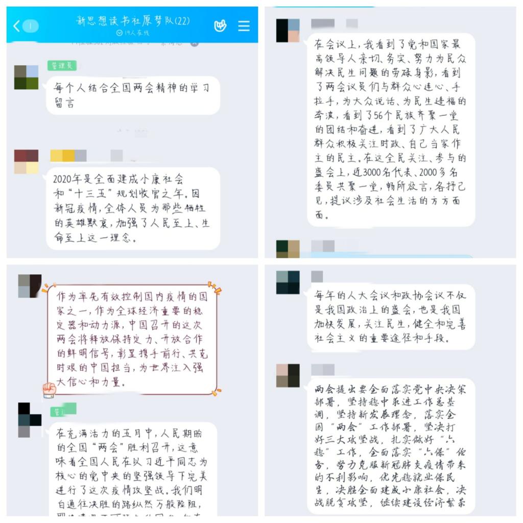 感受著全國(guó)兩會(huì)精神,新思想讀書(shū)社成員清晰地意識(shí)到作為青年大學(xué)生的責(zé)任與使命。青年強(qiáng)則國(guó)家強(qiáng),青年學(xué)子當(dāng)更加堅(jiān)定擁護(hù)黨與國(guó)家,銳意奮進(jìn),刻苦學(xué)習(xí),用知識(shí)力量與民族精神武裝自己,隨時(shí)為國(guó)家奉獻(xiàn)青春力量。唯有只爭(zhēng)朝夕,才能不負(fù)韶華!